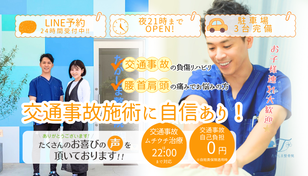 | 営業時間 | 完全予約制 月~土:9:00~21:00 日、祝:9:00~13:00 ※交通事故、ムチウチ対応は22:00まで受付 |
